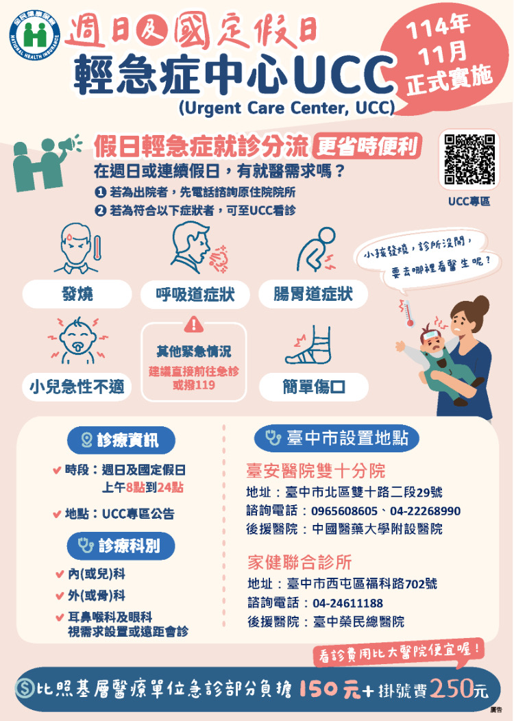 響應「全民健康保險週日及國定假日輕急症中心(UCC)試辦計畫」,台中市西屯區福科路家健聯合診所與大臺中市醫師公會、大臺中護理師護士公會、大臺中藥師公會、臺中市大臺中醫事檢驗師公會、臺中市醫事放射師公會等五大公會合作開辦假日看診,於11月2日開始執行,看診時間為早上8點到晚上24點,提供有需要的民眾醫療服務,共同紓解大型醫院急診室壅塞問題,分散照護輕急症病人。
